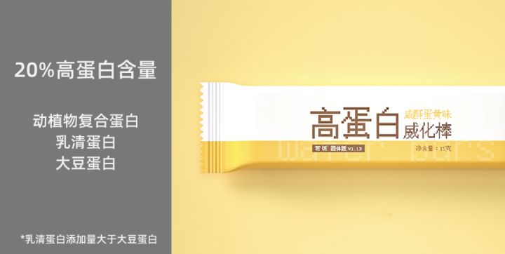 V1.13的蛋白质含量做到了20%,满足《GB28050》高蛋白食品标准,远超传统威化的蛋白质含量。为了实现更好的氨基酸组合,依旧和若饭其他产品一样,采用了动植物复合蛋白。乳清蛋白的添加量大于大豆蛋白。